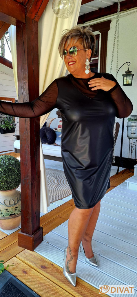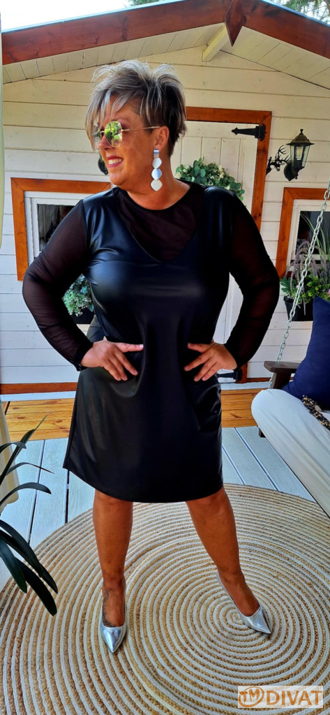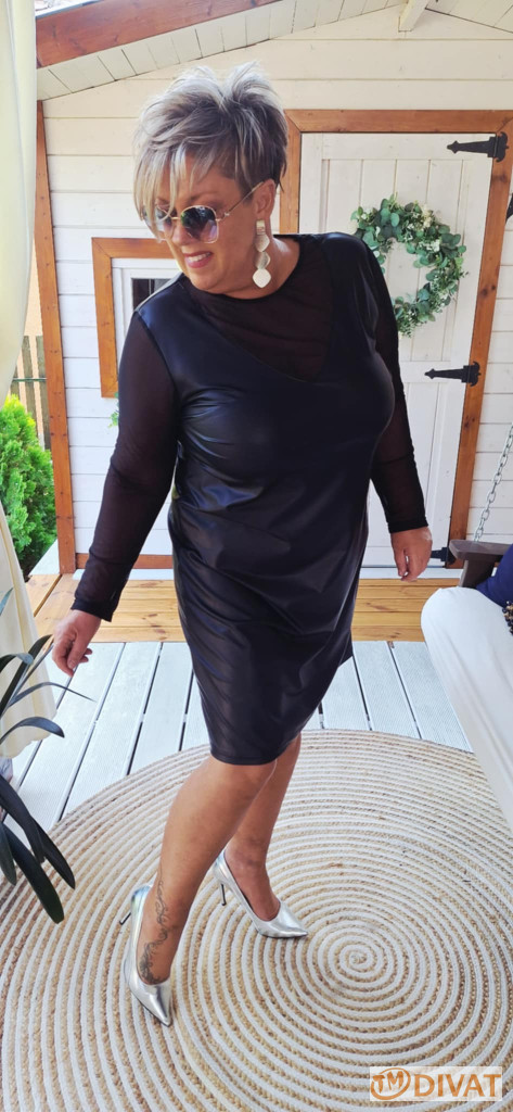 Hilton fekete bőrhatású ruha tüll betéttel.