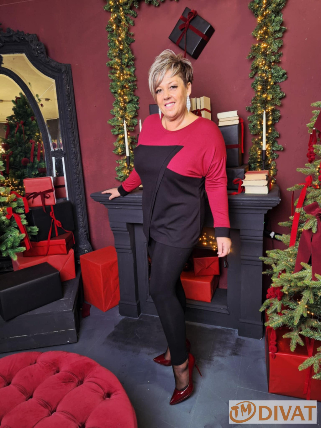 A modern színblokkolt megoldás és az aszimmetrikus szabás optikailag karcsúsít, szépen formálja a felsőtestet és kiemeli a nőies vonalakat