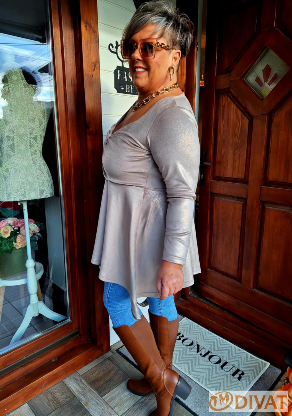 Fashion by NONO - Dália mellnél húzott extrán "A" vonalú champaine (pezsgő) tunika