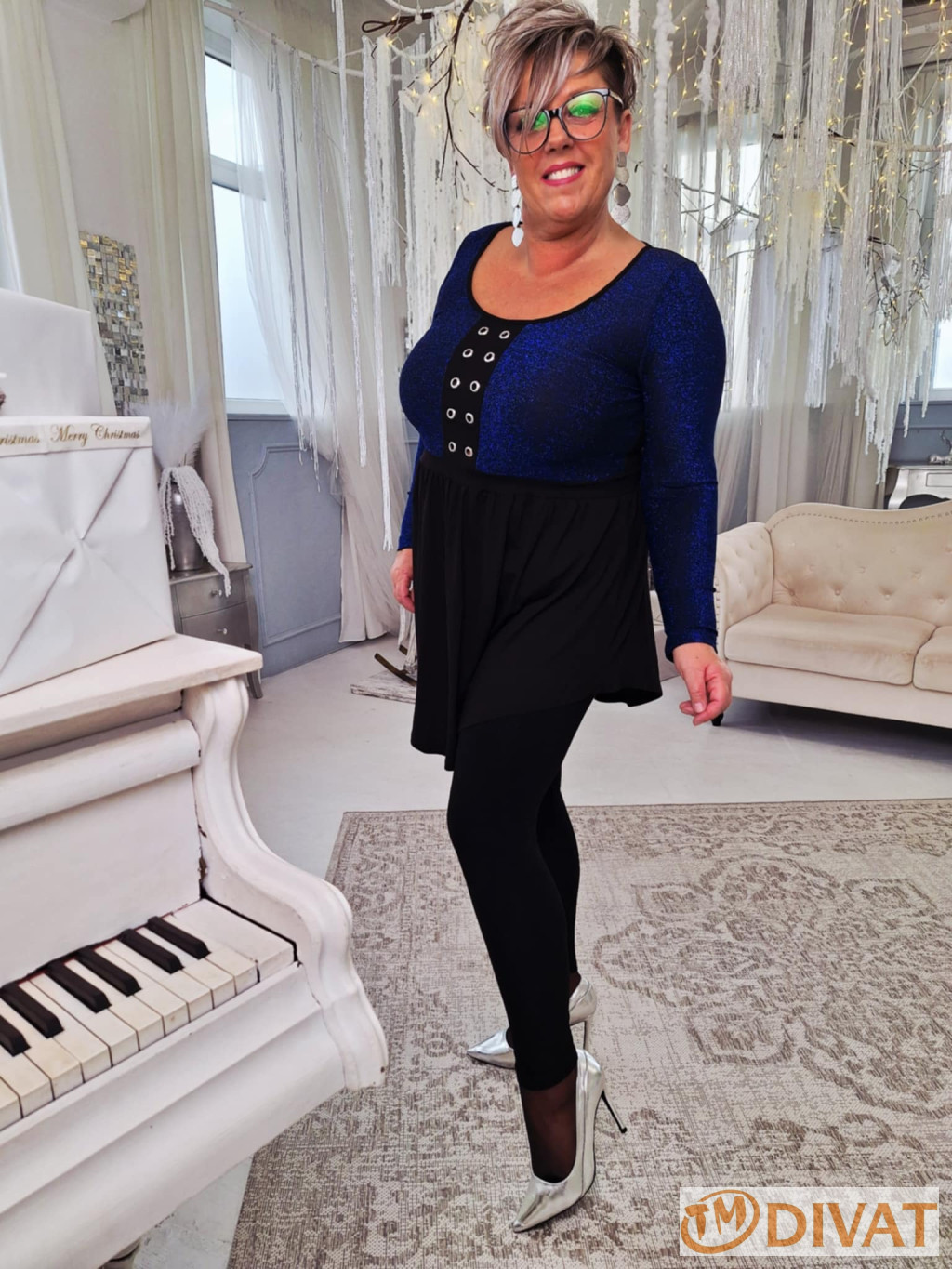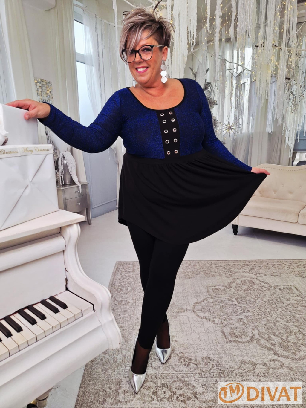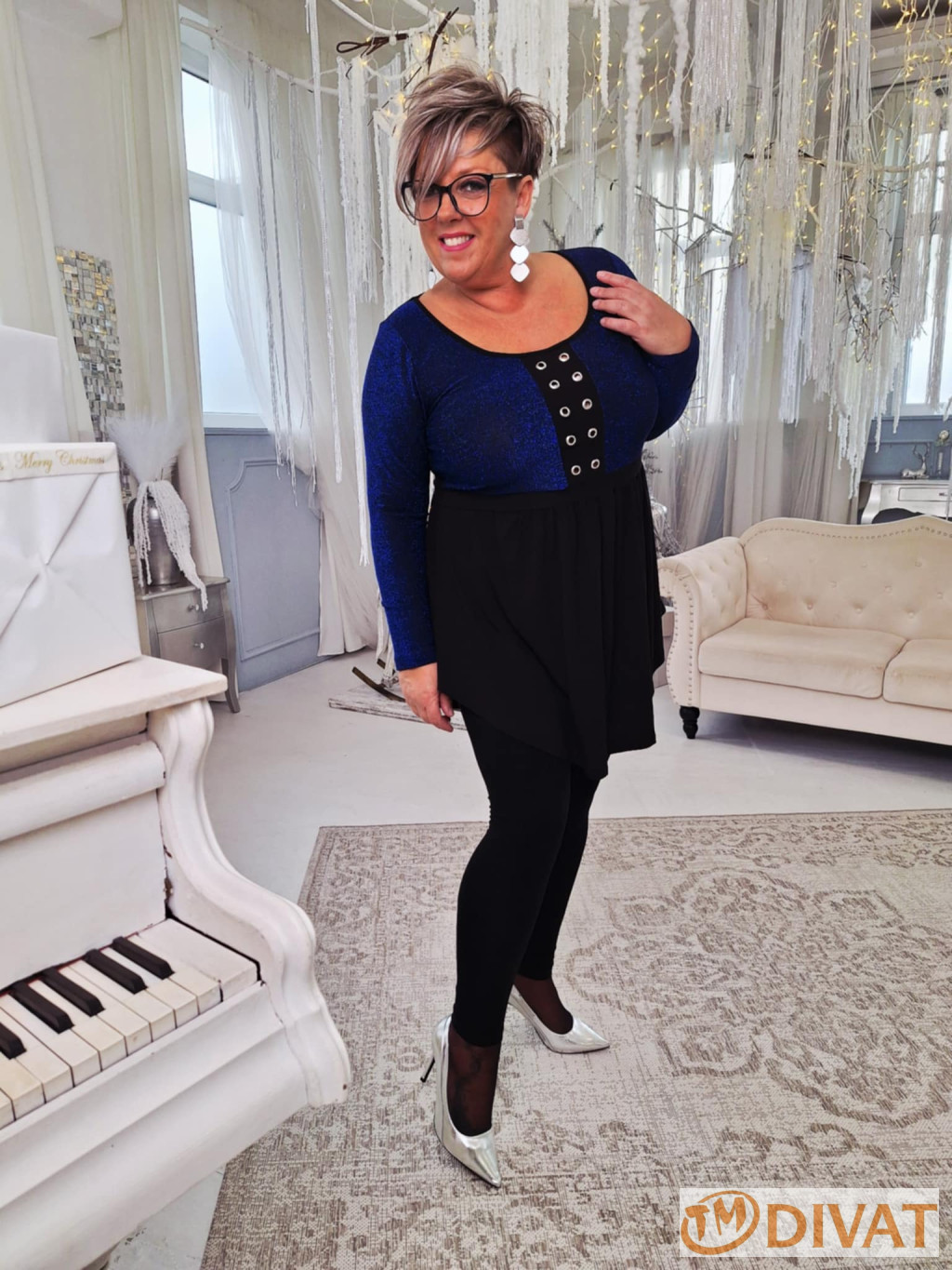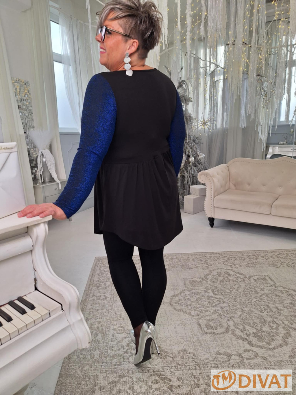 Bogi mellnél ringlivel díszített "A" vonalú fekete-királykék lurex tunika.